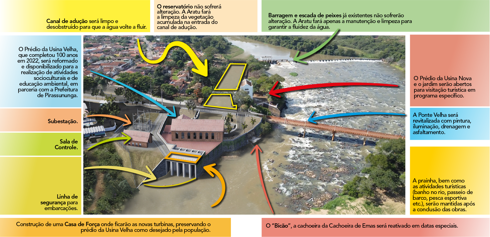 A Aratu já finalizou a reforma do Prédio da Usina Nova e estará aberto para visitação turística em programa específico em breve. A ponte velha será revitalizada com pintura, iluminação e novo asfaltamento. A prainha, bem como as atividades turísticas praticadas no local como banho no rio, passeios de barco, pesca esportiva etc., serão mantidas normalmente.